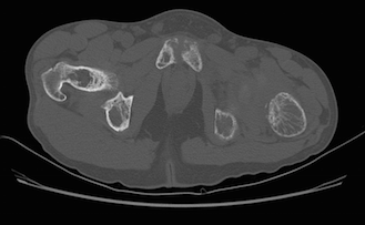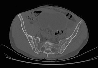 Alteração difusa do trabeculado ósseo em toda a região avaliada, associada a focos de reabsorção óssea subcondral na sínfise púbica e na borda anterior das sacroilíacas, relacionados à doença de base (hiperparatireoidismo).