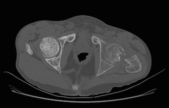 Associam-se sinais de fratura patológica no colo do fêmur esquerdo, com reabsorção óssea junto ao foco de fratura e desalinhamento entre os fragmentos, com sinais de derrame articular do quadril homolateral, de aspecto reacional.